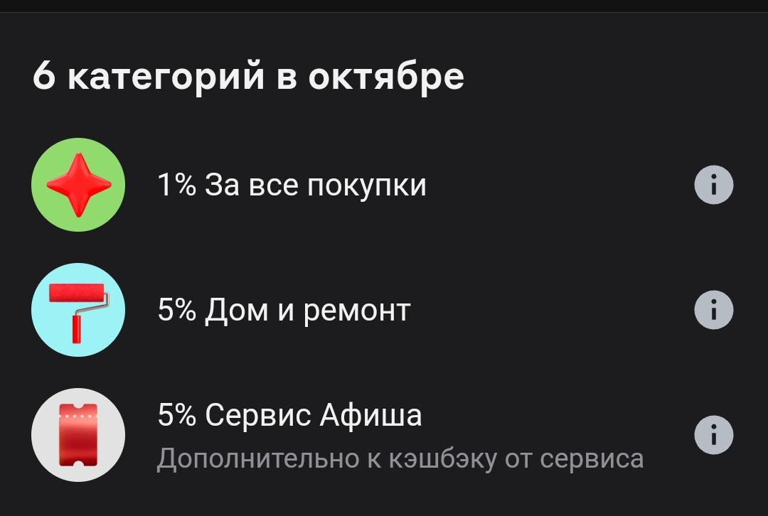 Октябрь начался, пора расставить акценты по кешбекам и посмотреть, чем мы богаты в этот раз. Спойлер: богатство что-то небольшое совсем 🤣 У меня сейчас в наборе есть 5 банков, с которыми мы сотрудничаем - я плачу их карточками, с они мне платят кешбек за это. С кем-то дружить и партнериться явно веселее. А кто-то жадина. Последние месяцы это прям топ по жадности и вредности. Всё время какую-то ерунду вместо порядочного кешбека подсовывает. 6 категорий - это, конечно, сильно сказано. 3! Вот потолок, остальное - это лишь красивая обёртка. И супер кешбек в этим месяце - на хобби 😁 аж 7%. Что под этим подразумевается - не знаю. Скорее всего, в этом месяце альфа снова мимо. Из того, что мне интересно - всё 1%, супера в городе 10% и 5% жд билеты. Ну тоже - ничего сверх естественного. А как же мы с тобой дружили до этого, эх, не дал мне банк в этот раз на супермаркеты ровно ничего, даже 1% на всё пожалел 😏 Но всё же есть тут интересные категории: контент 25% - как раз мне надо плат