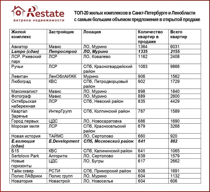 Лидером по количеству квартир в продаже стала Группа ЛСР (5,9 тыс. лотов), что объясняется крупнейшими в петербургской агломерации объёмами текущего строительства.