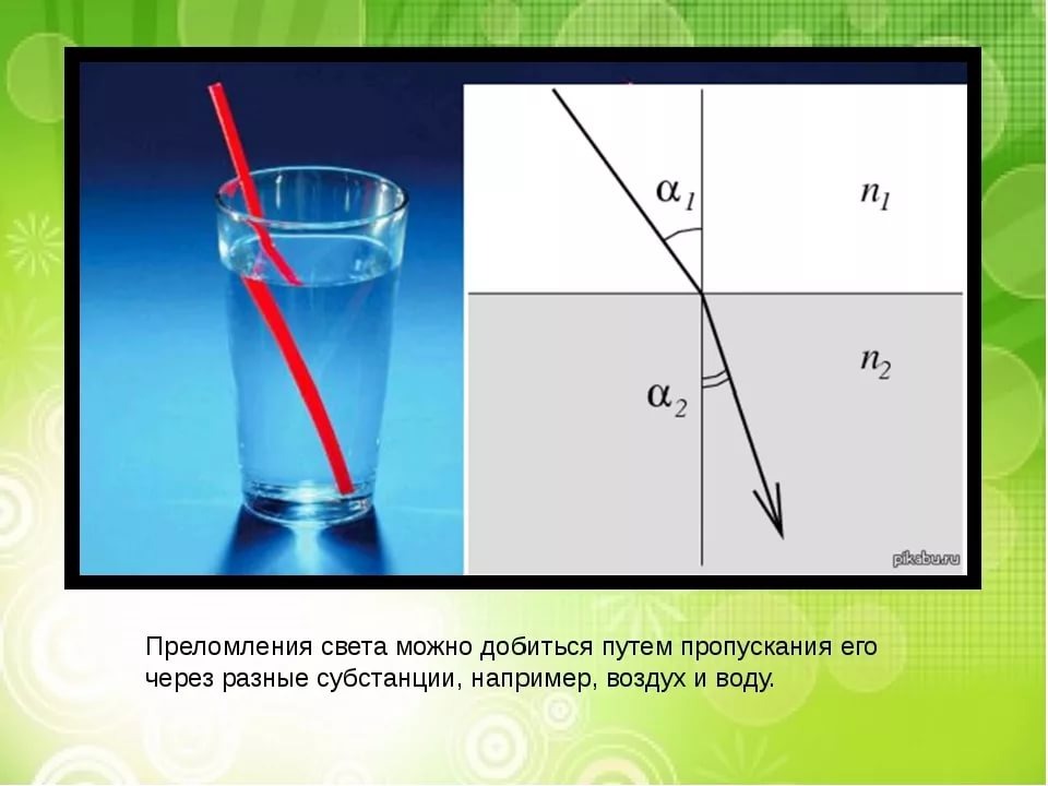 Для четкого понимания, почему вода прозрачна, а снег и пар белые, мы должны рассмотреть такое понятие как КОЭФФИЦИЕНТ ПРЕЛОМЛЕНИЯ СВЕТА. Преломление светового потока возникает при его прохождении через различные среды — на их границе. На картинке сверху видно, как световой поток изгибается по границе воздух-вода на примере опущенной в воду красной трубочки в стакане. Каждая физическая среда, будь то вода, воздух, стекло, алмаз и так далее, имеет свой коэффициент преломления, и чем этот коэффициент выше, тем сильнее изгибается поток света. Существуют специальные таблицы с коэффициентами преломления, которые считаются относительно вакуума (коэфф. 1), ну или просто прозрачного воздуха, который совсем незначительно отличается от вакуума. Зная эти коэффициенты, мы можем очень просто ответить на вопрос — будет ли настоящий алмаз виден в воде? Конечно будет! Ведь у воды коэффициент 1,33, а у алмаза — 2,42. И, кстати, искусственный алмаз, к примеру, из кварца или стекла, в воде будет почти н