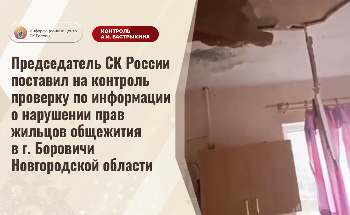 Председатель СК России поставил на контроль проверку по информации о нарушении прав жильцов общежития в г. Боровичи Новгородской области В социальных медиа сообщается о длительном непризнании аварийным общежития, в котором проживают сироты, по улице Транзитной в городе Боровичи Новгородской области. Из-за нарушения целостности крыши строение, 2010 года постройки, затапливает, фундамент проседает, в одной из квартир разрушился пол и частично обрушился потолок. Однако просьбы жильцов признать их дом непригодным для проживания игнорируются, им предлагается провести ремонтные работы за свой счет. В СУ СК России по Новгородской области организована процессуальная проверка. Председатель Следственного комитета Российской Федерации Александр Иванович Бастрыкин поставил ход процессуальной проверки на контроль в центральном аппарате ведомства и поручил руководителю СУ СК России по Новгородской области Николаю Николаевичу Супруну представить доклад о ее промежуточных результатах и принятом по ито