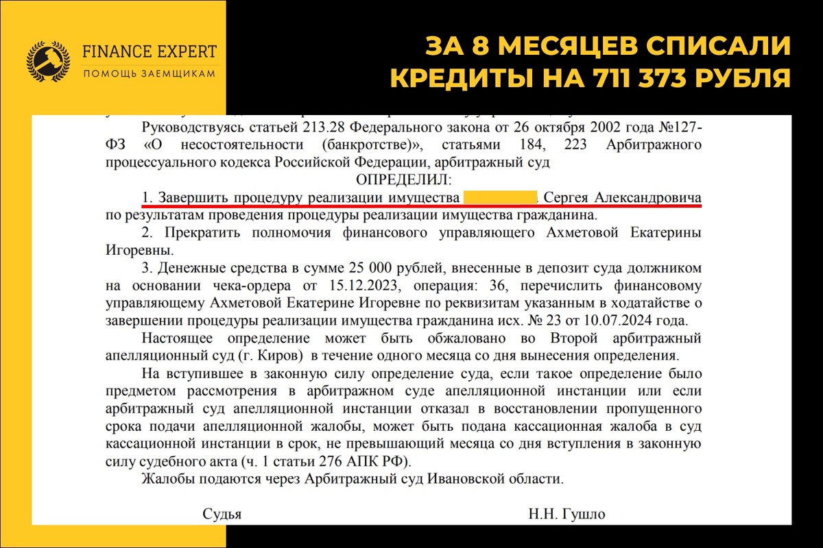 Всего за 8 месяцев мы полностью освободили Сергея от всех кредитов на сумму 711 373 рубля. Процед
