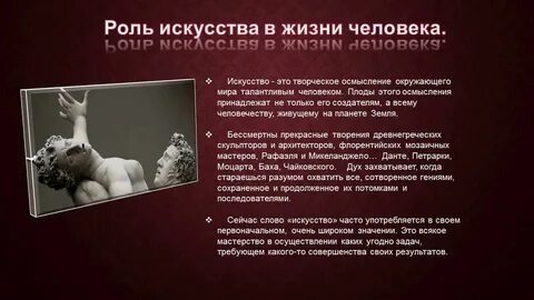 Роль искусства в обществе прослеживается на протяжении тысячелетий. Посредством него люди отражают свои творческие способности, запечатлевают и воспроизводят собственные думы, фантазируют и описывают происходящие события. Оно требует мастерского подхода. О том, какова роль искусства в жизни общества, пишут многие обществоведы и философы. Это возможность самореализации, проявления себя, как личности. Человек говорит о своем внутреннем мире, духовных ценностях и переживаниях. Через литературу, картины и скульптуры люди повествуют о своих чувствах, эмоциях, процессах развития и достижения целей. Искусство – это духовная деятельность людей, которая зарождалась и развивалась вместе с человечеством. Первые проявления творчества – это наскальная живопись. Тогда роль искусства в жизни человека заключалась в краткой передачи информации. Люди общались между собой, используя рисунки и символы. Во все времена человек стремился запечатлеть свое отношение к жизни в разных видах искусства. Все жиз