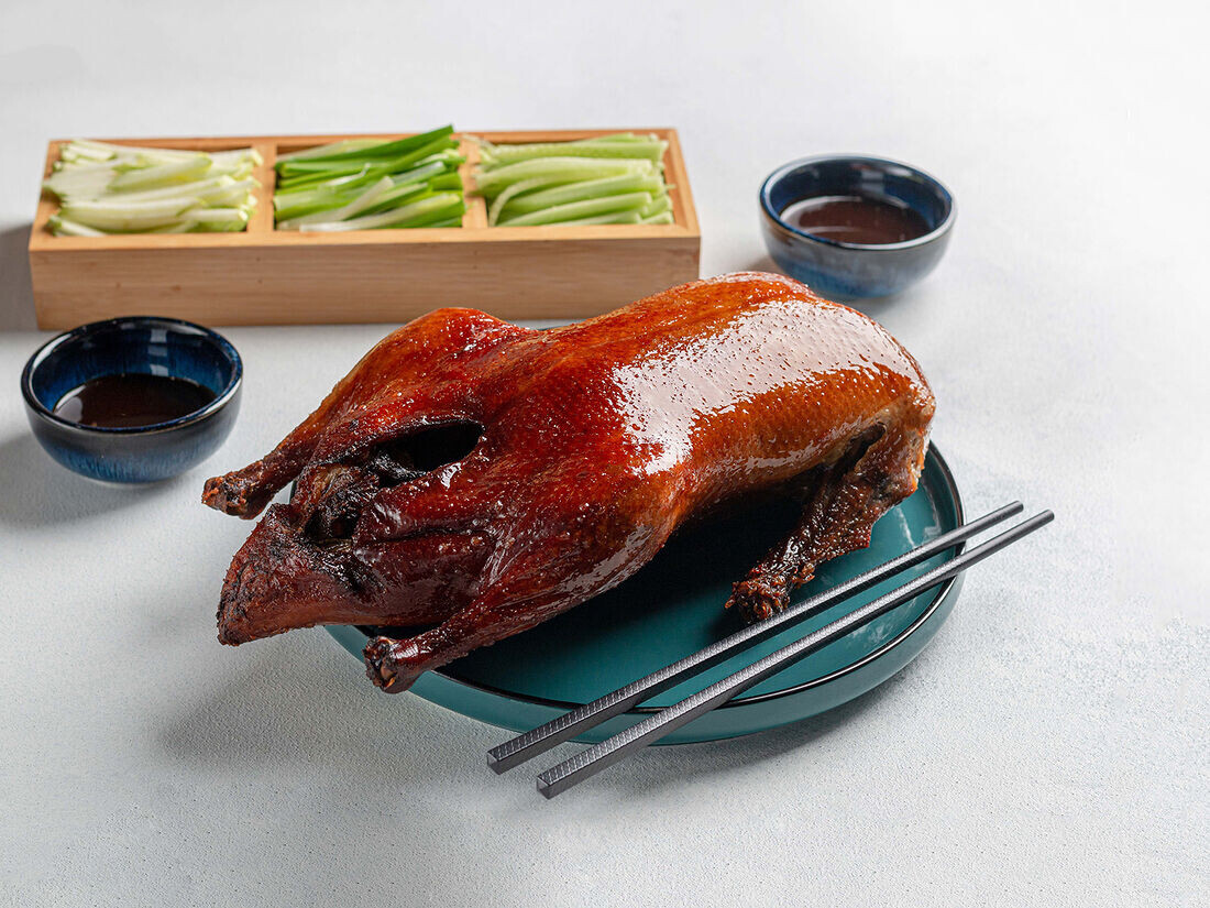2 ч. л. молотого имбиря 1. Обработанную утку хорошо промыть, просушить бумажными полотенцами, обрезать кончики крыльев и удалить лишний жир. 2. Натереть солью сверху и изнутри, замариновать водкой или джином и поместить птицу в холодильник на ночь. 3. Обмазать утку смесью из меда, соевого соуса и имбирного порошка и снова убрать в прохладное место на 3-4 часа. Медово-имбирный соус необходимо оставить, поскольку он понадобится при приготовлении. 4. Уложить утку на лист фольги и завернуть ее. Переложить на противень. 5. Поставить в разогретую до 200оС духовку примерно на 1,5 часа. 6. Вынуть утку, снять фольгу, полить ее оставшимся соусом и снова отправить в духовой шкаф на 40 минут при температуре 220-240оС, пока не зарумянится. 7. Проверить готовность: воткнуть в мясо острый нож, если сок вытек прозрачный, без крови – значит, птица готова. 8. Нарезать готовую утку по-пекинс
