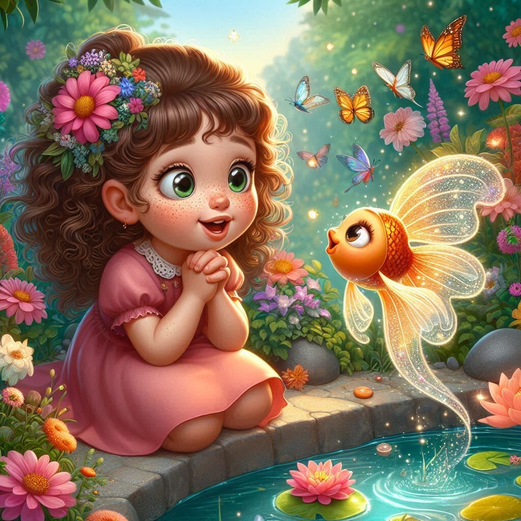 Жила-была в одной далёкой деревушке маленькая девочка по имени Настенька. Она была доброй и весёлой, а главным её увлечением было гулять на природе. Любила она бродить по лесу, собирать цветы, наблюдать за птицами и слушать, как ветер шелестит в листве. Но больше всего Настенька любила ходить на берег реки, которая протекала недалеко от их дома. Однажды, в один солнечный день, когда Настенька пришла к реке, она заметила что-то необычное. В воде блеснуло что-то золотое. Девочка подошла поближе и увидела, что в прозрачной воде плещется маленькая золотая рыбка. Рыбка была необыкновенной красоты: её чешуйки блестели, словно сделаны из чистого золота, а глаза искрились как звёзды. Настенька, не думая долго, бережно взяла рыбку в руки и хотела отпустить обратно в воду. Но рыбка вдруг заговорила человеческим голосом: — Спасибо тебе, добрая девочка, что не оставила меня в беде. Я не простая рыбка, а волшебная. За твою доброту я исполню три твоих желания. Только подумай хорошо, прежде чем загад