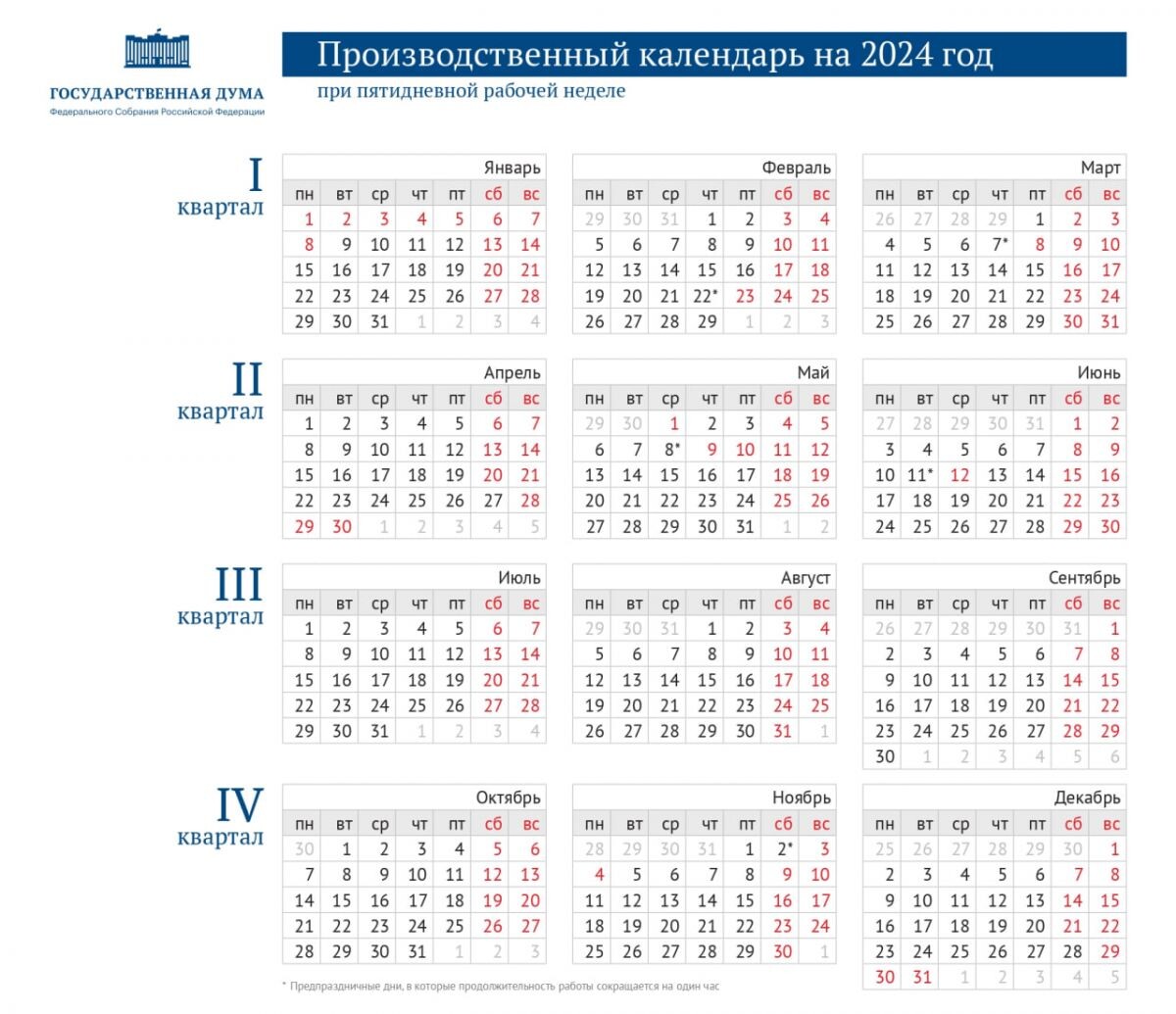 В конце октября воронежцев ждет шестидневная рабочая неделя, с 28 октября по 2 ноября. Производственный календарь на 2024 год был опубликован на сайте Государственной Думы. Увеличение рабочих дней связано с тем, что 30 апреля было выходным днем, за счет чего россияне отдыхали с 28 апреля по 1 мая. 2 ноября будет сокращенным днем, после чего воронежцев, как и остальных жителей России, ждут два выходных дня, 3 и 4 ноября, связанные с празднованием Дня народного единства. Ранее Минтруд России опубликовал календарь выходных на 2025 год. В новом году нерабочие праздничные дни, совпадающие с выходными, перенесут на рабочие.