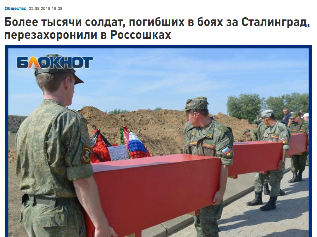 В сети распространяют информацию, что в Курской области якобы роют траншеи под братские могилы для бойцов СВО. Сообщения подкрепляются роликами церемонии массового захоронения в присутствии большого количества военнослужащих. «Нет ни опознания, ни семьи, чтобы заявить о них. Просто дыра в земле», — говорится в описании к ролику. Фейк выдают сразу несколько моментов. На видео запечатлено перезахоронение останков красноармейцев, которые пали при обороне Сталинграда. Церемония состоялась более четырех лет назад: 23 августа 2020 года в 34 км от Волгограда, на мемориальном комплексе «Россошки». Аналогичные захоронения были и в 2019, 2021, 2023 и 2024 годах. 23 августа является знаковой датой для поисковиков. В этот день ежегодно по традиции на Россошинском военно-мемориальном кладбище предают земле останки защитников Сталинграда, поднятые за год. Именно 23 августа 1942 года город столкнулся с массированной бомбардировкой и едва не был стерт с лица земли. Гражданская инфраструктура была в ру