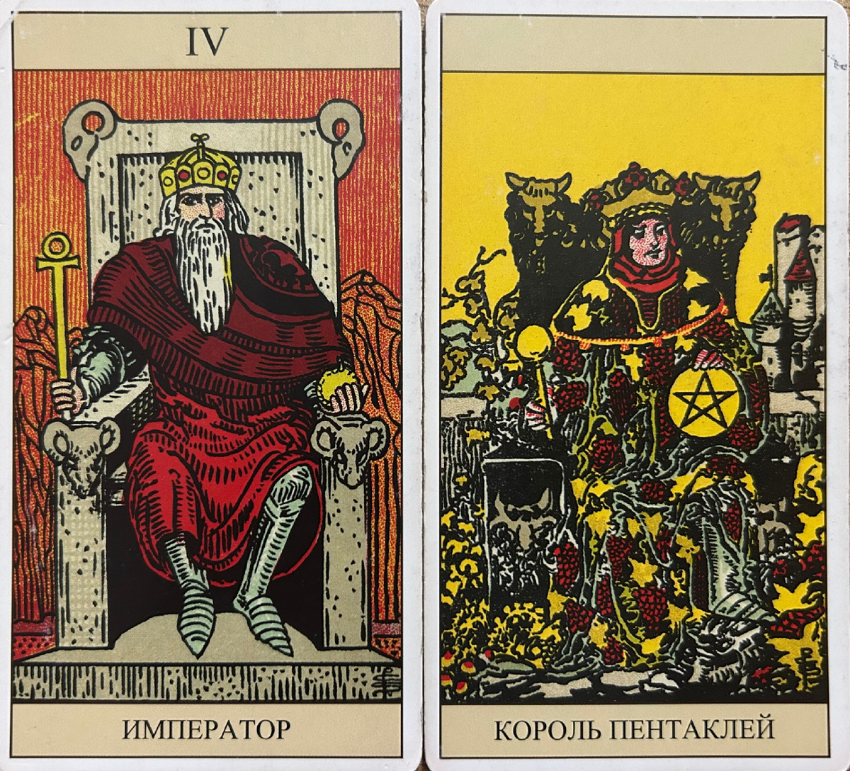 - Оба — боссы. Император — это архетип лидера, Король Пентаклей — тоже, но с упором на материальную сторону дела. Оба любят контролировать, но если Император управляет людьми и структурами, то Король — активами и финансами.