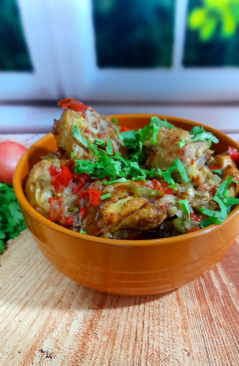 Вкусная, ароматная курочка, всегда придётся к столу. Ингредиенты Курица 1,5 кг ( куриную грудку в это блюдо не использую) Лук репчатый 2 шт ( крупный) Болгарский перец 2 шт Помидоры 300 г Чеснок 4 зубочка Мука 1 ст.л. Соль 1 ч.л. без верха или по вкусу Специи Хмели-сунели 0,5 ч.л. Приправа для курицы 1 ст л. Зелень петрушки, кинзы по 1 небольшому пучку Приготовление Курицу нарезать на порционные куски, посолить, добавить 1 ст л. приправы для курицы, перемешать, обжарить на хорошо разогретой сковороде с добавлением растительного масла. Далее, обжаренную курицу нужно убрать из сковороды и в неё же высыпать нарезанный кубиками или полукольцами ( кому как нравится) лук. Обжаривайте лук на сильном огне минуты 2-3 и добавьте нарезанный также как и лук красный болгарский перец, огонь убавляем до среднего и жарим пару минут, добавляем 1 столовую ложку муки. Перемешиваем овощи с мукой и добавляем натёртые на тёрку помидоры, и чеснок, добавьте хмели-сунели. Ещё немного потушить на медленн