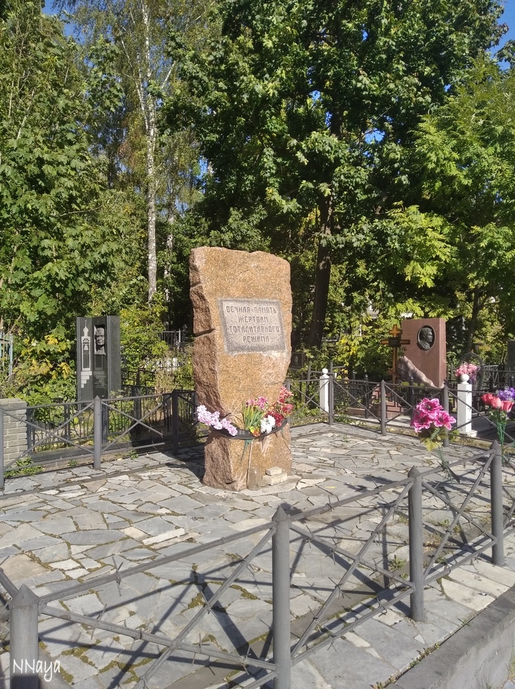 Если мы от ворот двинемся по направлению к правой дальней части Бугровского кладбища, то вскоре дорожка выведет нас на небольшую площадь, свободную от захоронений. На ней - каменный мемориал жертвам репрессий.