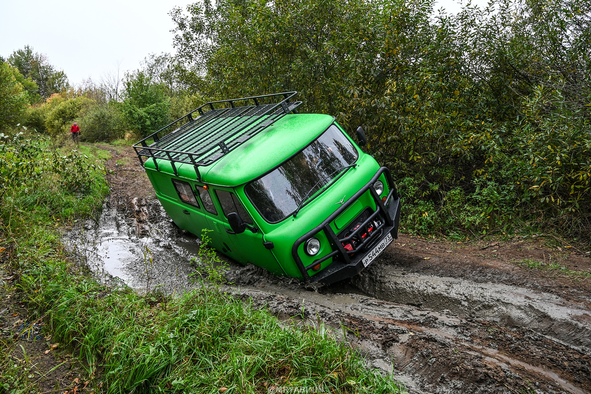 Да, блин, можете смеяться, но мы снова чуть не опрокинули Буханку! Если бы водитель струсил и нажал бы на тормоза, то Буханочка легла бы, милая в грязьку как раз пассажирскими дверями, но водитель оказался не из числа слабаков и вдавил педаль газа в передний бампер. Может быть от страха, конечно, но это уже не важно для истории, потому что Буханочка просто вылетела из ямы и встала на все четыре колеса. Выдыхаем, бобры! Водитель второй Буханки решил не рисковать и попробовать штурмовать опасную яму в лоб. Что из этого получилось вы уже поняли. Буханоид плотно прилип в колее мостами и защитами, и сдвинуть его с места и как-то вынуть из грязи получилось только лебедкой и то двумя заходами. Впрочем, второй был уже несколькими метрами дальше, потому что водитель решил, что вторую колею он тоже ходом пройдет. Нивавод, что говорить! Покатушка удалась на славу. Для гостей были прокатаны четыре спецучастка разной сложности и разного формата, начиная тренировочным оффроудом, продолжая раллийным