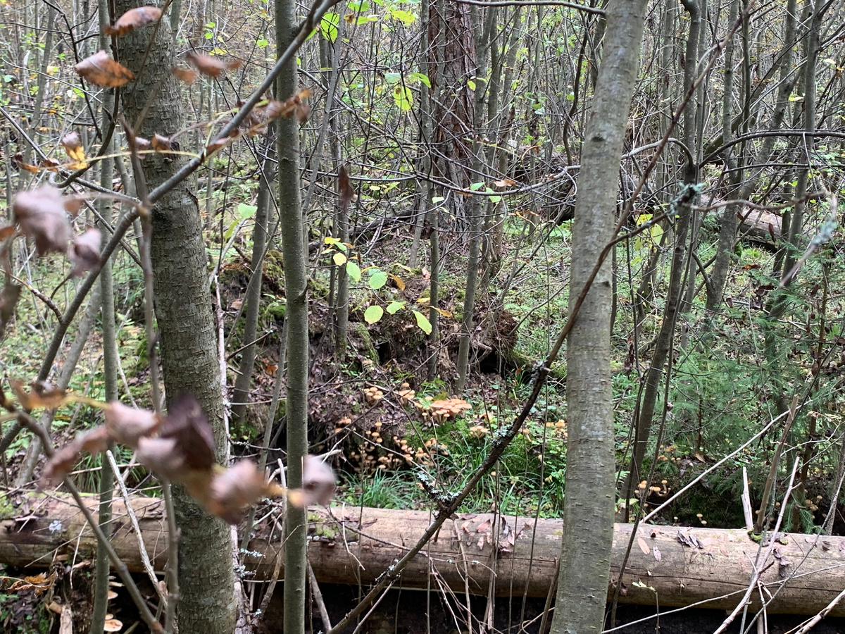 Продолжаю свои вылазки, и вновь попал на участок. который буквально изобилует грибами, в частности - опятами. И хотя я практически никогда опят не собираю, так уж у нас повелось, но внутренний азарт и эффект накопительства начинает пробуждаться, он говорит:"Не проходи мимо, собери, это дары леса, собирай!" Устоял, просто сделал несколько фотографий, пошел дальше. Как видно по первой фотографии, данное место нашел в некоторых зарослях и завалах. Это и кустарник, и упавшие деревья, и признаться, пробираться не особо удобно, так как упавшие стволы деревьев стали скользкими, и соблюдая технику м правила лесного передвижения, наступать на них не рекомендуется. Дело в том, что остатки коры, которая осталась на таких стволах, отслаивается от самого ствола, ну а со стороны всё выглядит вполне нормально. В итоге, наступив на такое дерево, можно не рассчитать свои силы и саму ситуацию. Кстати, обратите внимание на фото выше: спокойно уживаются два вида грибов: и трутовики, и опята. С точки зрен