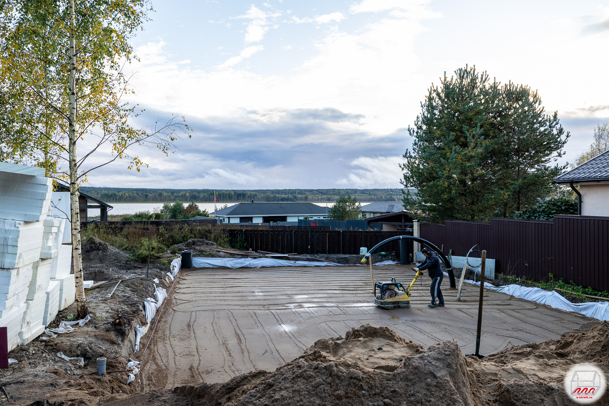 Вновь вернулись на объект в Волочаевке, где в 2021 году строили УШП для двухэтажного дома, с целью строительства фундамента для бани. Место, как видите, неплохое – рядышком берег Волочаевского озера. Мы подготовили песчаную подушку и сейчас тщательно трамбуем её виброплитой. Рабочий методично ходит "змейкой" вдоль и поперёк: Большая чёрная труба – это теплотрасса в основной дом, с помощью которой баня будет обеспечена отоплением и горячей водой: Удовольствие, прямо скажем, недешёвое: Но при наличии газа в основном доме и желании отапливать баню тем же самым котлом (точнее каскадом из двух котлов т.к. дом там довольно большой), затраты на теплотрассу оправданы – это лучше, чем согласовывать новый проект для подключения газа к бане, ставить там отдельный газовый котёл, счётчик, обслуживать всё это... Трубу, к слову, можно сделать и самодельную, что будет дешевле. Фундамент для дома, тоже УШП, на этом же участке мы строили 3 года назад, а дальше заказчик уже делал всё самостоятельно и