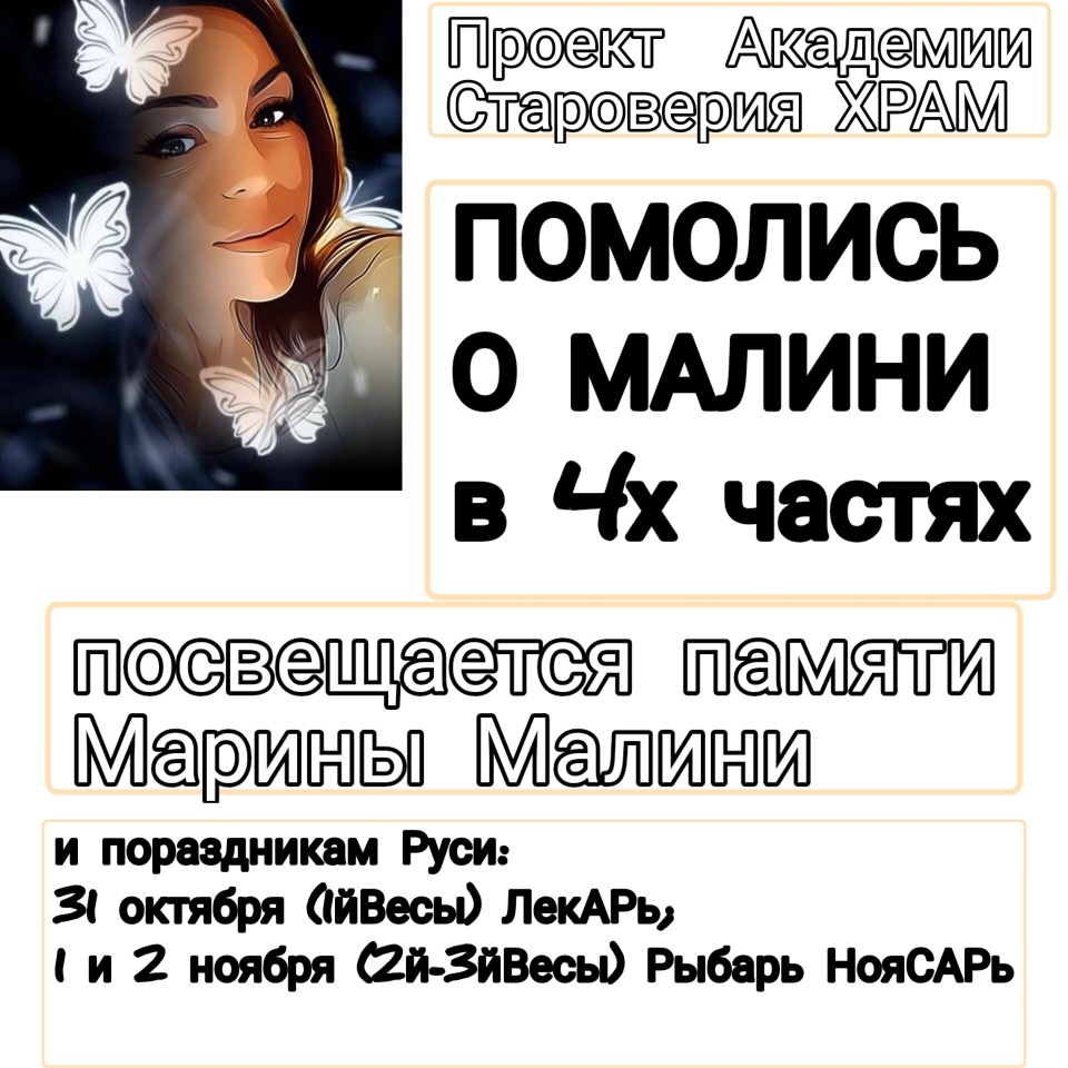 ПОМОЛИСЬ О МАЛИНИ Проект Академии Староверия ХРАМ Памяти Марины Малини, родившейся 2 ноября и покинувшей сей мир 18 декабря 2023, как образ Руского пораздника Ноясар Рыбарь 1 ноября. Светлой дороги нашей современнице и подвижнице Малини, показавшей на своем канале Академию Руских Изтин уникального Хранителя Знания Руси Вячеслава Куланова!( https://академия-храм.рус/) Молитва 1. 1.Помолись о Малини, не много не мало: Ровно столько, чтоб воли ей к жизни достало. Для любых воплощений: земных, иномерных, Для прекрасных творений – и дерзких, и мирных! 2.Помолись о Малини, о лучшем маршруте – Нет сомнений в помине, найтись в перепутье. Для знакомств, путешествий и новых открытий – Все на свете молитвы вы соедините! 3.Кто умеет, по-руски, иль даже без слова, Умолите Малини придти сюда снова, Чтобы с ней не искали вражды, не судили Те, кто в ней свою копию лишь находили! 4.Не посмели чтоб Мойры ни грубые Парки Рвать своим произволом ее выбор яркий Чтоб везде пролетала она, проходила, Чтоб энер