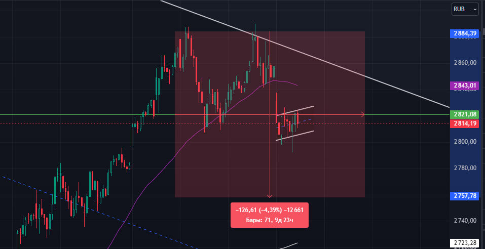 $IMOEX 🏦 ❗️Подтвердили фигуру двойная вершина, А значит движение на понижение цены будет продолжено. Уровень, на котором сейчас находится цена - 2814, 89, очень похоже, что строит флаг для того, чтобы продолжить падение. ⚠️Как я и говорила в предыдущем разборе: отработка двойной вершины до 2740, скорее всего протащат ниже, потому что отработка такого флага до 2730. 🕯Товарищи, многие трейдеры ошибочно предполагали, что цена пойдёт выше 2900, но давление медведей в рынке больше, не смогли пробить стенку канала. 🟢Надеюсь многие меня послушали и не заходили в длительные позиции. Сейчас, в ожидании падения, скорее всего подходит более спекулятивная торговля. Всем удачи в торгах. НЕ ИИР #теханализ #индекс