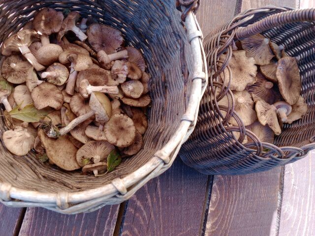 Есть у русских грибников, хорошая примета-хочешь собрать опят, возьми с собой собаку. Вот и мы, взяли с собой собаку Варю и сразу же вышли на грибное место. Грибы на 2 октября всё те же -опята осенние. Точнее, тот их немногочисленный выход, который вырос в теплую и сухую погоду ещё неделю назад. А сейчас они дорастают и понятное дело уже почти заканчиваются. Но, по немногу набралось. Спасибо Варе... Где сейчас растут опята и не угадать. Вырасти могут в любом месте. Найти можно и в березнячке и среди елок. Причем в отличии от благородных-подосиновиков и подберезовиков, на местах посуше, примерно с той же вероятностью, что и в мшистых низинках. Не угадать. Так, что если опята и находятся, то это в основном уже лопухи. В основном опята земляные, то бишь растущие на корнях. Если и на деревьях, то у их основания. Опята уже и чернеют и еще и с жучком. Да и червивые встречаются. Уже надо сортировать весьма тщательно. А что делать, опята сходят. Ложные опята встречаются. Даже можно сказать лож