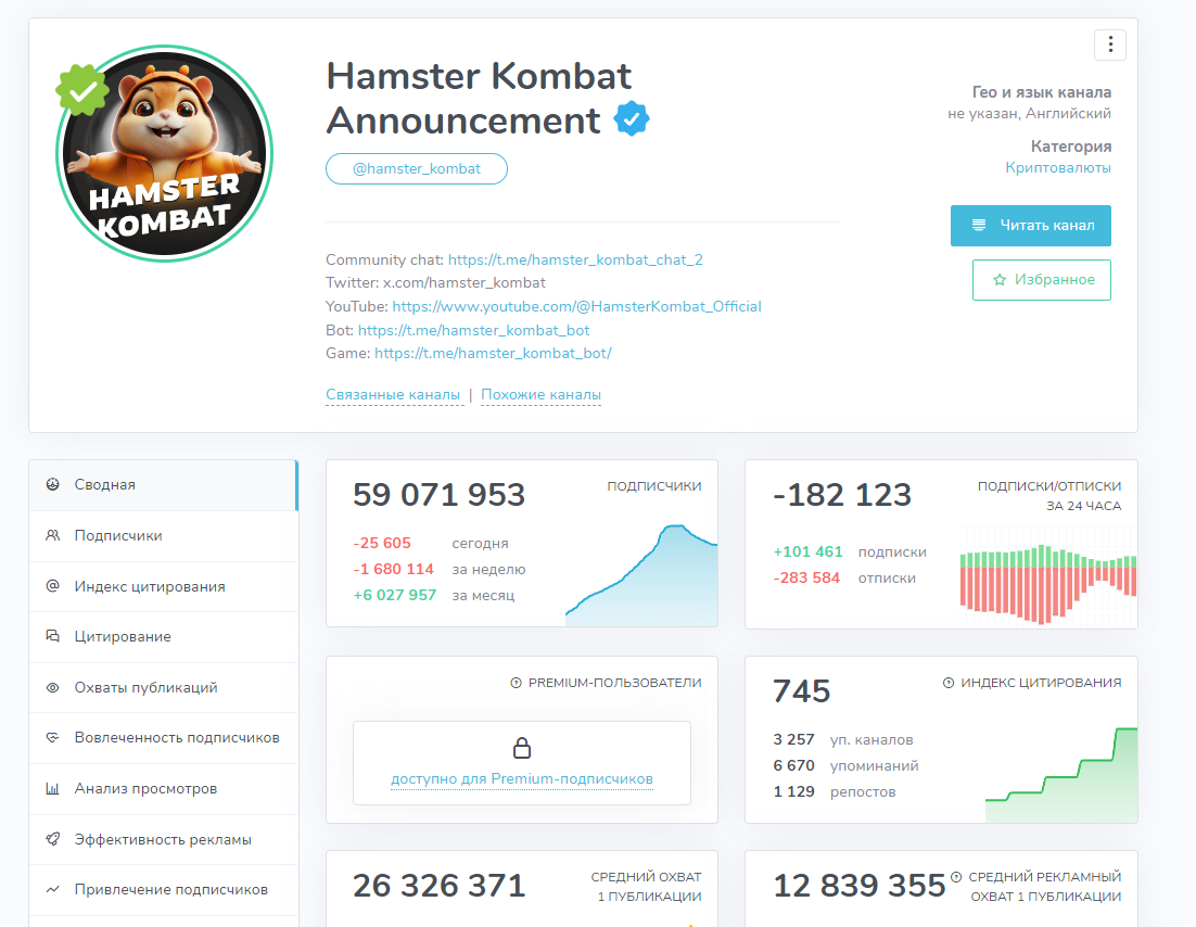 После листинга монеты $HMSTR, начались массовые отписки от официального телеграмм канала Hamster Kombat За неделю после листинга монеты, от telegram канала отписалось 1.680.144 человек и 25.605 за сегодня В среднем отписывается по 180 тыщ. человек, за 24 часа Вовлеченность аудитории, также имеет отрицательный рост Но даже не смотря, на потерю аудитории, цитируемость канала, другими каналами, не перестаёт падать, а только растёт Публикации постов резко прекратились