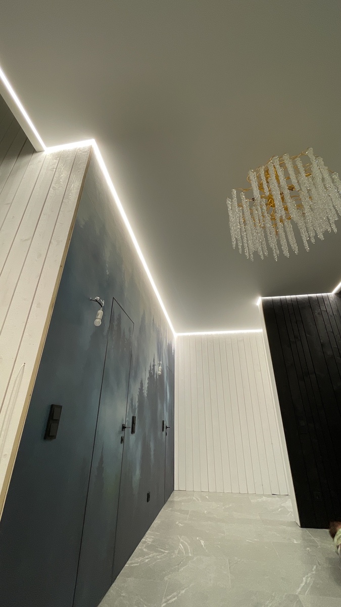 Световая лента в парящем потолке создает мягкую подсветку, но основной свет она не заменит.