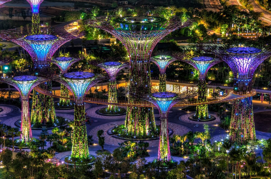 Ночью деревья украшают сад сиянием разноцветных огней, что сопровождается музыкальным шоу. Выглядит это очень необычно и красиво.