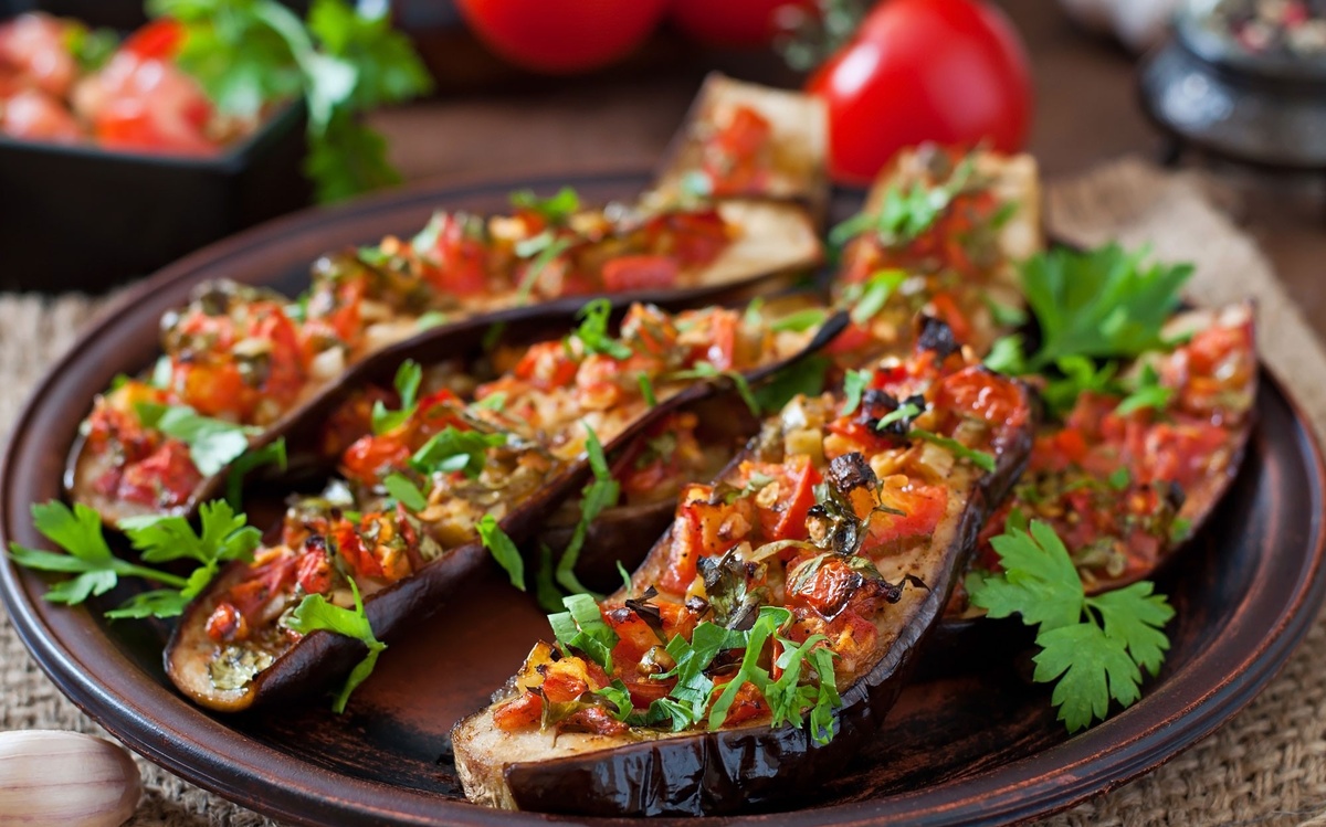 ИНГРЕДИЕНТЫ НА 4 ПОРЦИИ Баклажан 2 шт. Томат (помидор) 150 г Перец сладкий красный 150 г Лук репчатый 80 г Морковь 70 г Чеснок 4 зубчик(а) Масло растительное рафинированное 3 ст.л. Паприка сладкая молотая 1 ч.л. Зелень сушёная 1 ч.л. Молотый черный перец Соль Зелень для подачи Приступаем к готовке. Баклажаны разрежьте вдоль пополам, не удаляя плодоножки — так, чтобы половина плодоножки сохранилась у каждой лодочки. Это не только декоративный элемент: ножка обеспечит дополнительную крепость конструкции. Острым ножом сделайте глубокие прорези в мякоти баклажанов в виде решетки, не задевая кожицу. Натрите синенькие солью, смажьте растительным маслом, положите в форму для запекания и поставьте в духовку, разогретую до 200°С на 20 минут. Очистите лук и нарежьте маленькими кубиками. Зубчики чеснока раздавите плоской стороной ножа, очистите и измельчите. Морковь вымойте и натрите на крупной терке. Из перца удалите семена и соединительные перегородки. Нарежьте перец маленькими кубиками. Из пом
