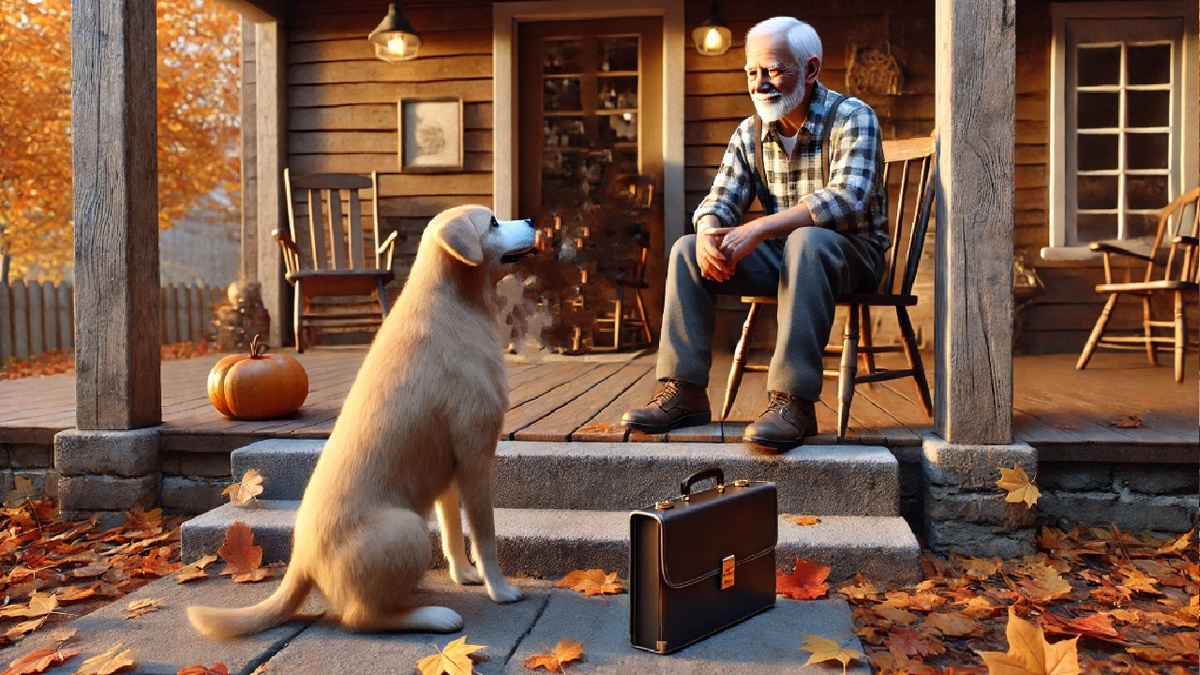 Михеич тяжело вздохнул и сел на стул, который он поставил на крыльцо накануне. И вот только он стал думать, что же это мог быть за чемодан, как увидел, что его верный пес, тащит в зубах старую, пыльную вещь, напоминающую кожаный портфель... Михеич не поверил своим глазам. А пес виновато отвел глаза в сторону. Рядом с ним стоял маленький чемоданчик.