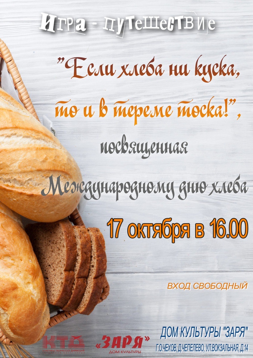 💥 Жителей и гостей городского округа Чехов приглашаем на игру - путешествие 17 октября в 16.00 пройдёт игра - путешествие "Если хлеба ни куска, то и в тереме тоска!", посвящённая Международному дню хлеба 📶 Категория: Встречи 🚫 Возраст: 0+ 📆 17.10.2024 🕕 16:00 🏢 ДК «Заря» 📍 г.о. Чехов, д. Чепелево, ул. Вокзальная, д.14 🪙 Стоимость билетов - Бесплатно❗️ #КТД #ГоспабликиМО #ГородскойОкругЧехов #ДКЗаря #Чепелево