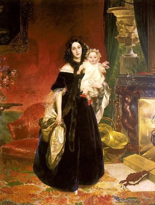 К.Брюллов «Портрет Марии Аркадьевны Бек с дочерью Марией на руках» («Portrait of Mariya Arkadyevna Bek with her Daughter» by Karl Briullov) написан в 1840 гг. Карл Брюллов — единственный русский художник, удостоенный при жизни лаврового венка и бриллиантового перстня из рук императора. За «Последний день Помпеи» его назвали «первой кистью государства». Брюллов создал более 200 парадных и камерных портретов и расписал купол Исаакиевского собора площадью 800 квадратных метров. В 10 лет был зачислен в Петербургскую Академию Художеств. Современник писал о Марии Аркадьевне: «По высоте и прекрасным свойствам её души, княгиня была из тех женщин, которых очень редко люди встречают на своем пути…. Не запомню красоты, подобной её. Это была прекраснейшая мраморная статуя величайшего из художников, оживленная изящным сочетанием грации и величия, спокойствия и сердечности, на которой улыбка всегда сливалась с кротким и ласковым взглядом. Её наружность напоминала двух женщин: величественную коро