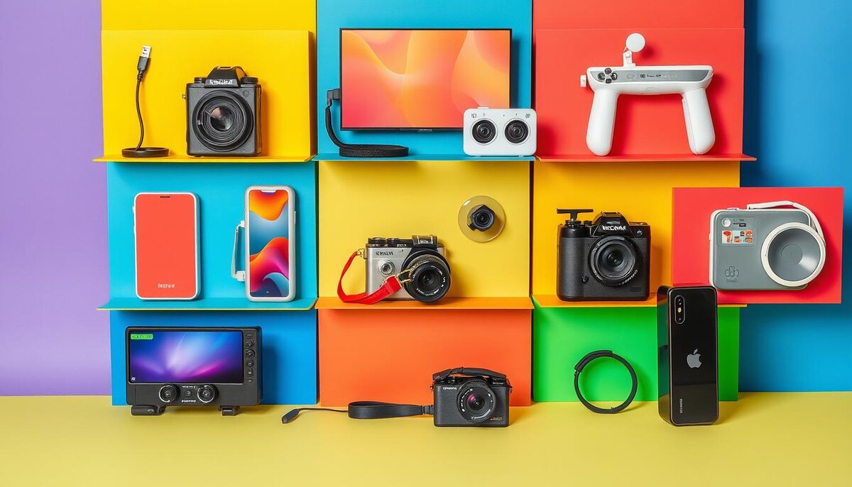 A vibrant and eye-catching display of ten distinct budget-friendly models, each showcased on a colorful backdrop. Include a variety of products such as electronics, fashion items, and household gadgets, with emphasis on their appealing designs. Arrange them in an aesthetically pleasing layout, highlighting their features and making them look attractive and accessible, using a harmonious blend of colors and textures to create an inviting atmosphere.