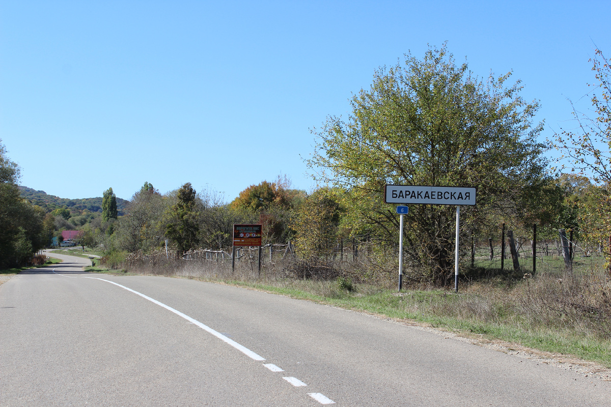 От станицы Губской до Баракаевской шоссе вьётся по полям, ныряет в живописные балки, где кусты подступают к узкой обочине, выпрямляется в стрелу и несётся по лесопосадке из пожелтевших ясеней прямо до первых хат, утонувших в виноградных зарослях. При въезде видна ферма, где ближайший коровник превратился в развалину. Проехав дорожный знак с названием населённого пункта, автомобиль покатился по улицам станицы. По бокам замелькали домики, разно-цветные заборы с прорехами проулков, и машина остановилась на стоянке в центре станицы.