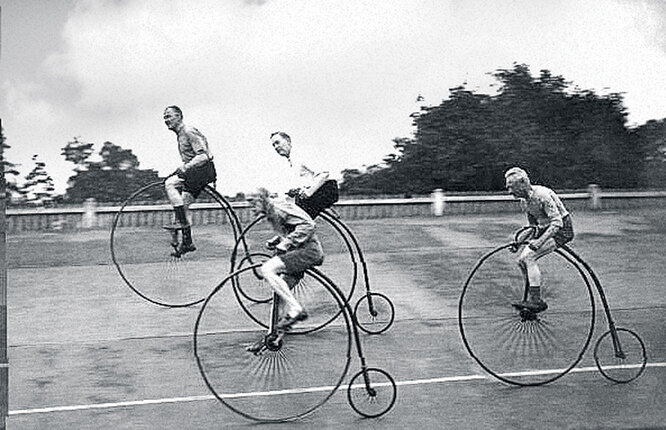 Это "Пенни-фартинг", такое необычное название получил один из ранних видов велосипеда. Был популярен в конце третьей четверти 19 века. А это фото 1908 года, здесь велосипеды уже более современные, но унаследовали от предыдущих важную особенность - фиксированную передачу. Если простыми словами, то велосипеды с фиксированной передачей, их еще называют Fixed Gear, отличаются от обычного горного велосипеда со свободным ходом тем, что скатываясь с горки не получится отдохнуть и перестать крутить педали, так как педали напрямую "подсоединены" к колесу.