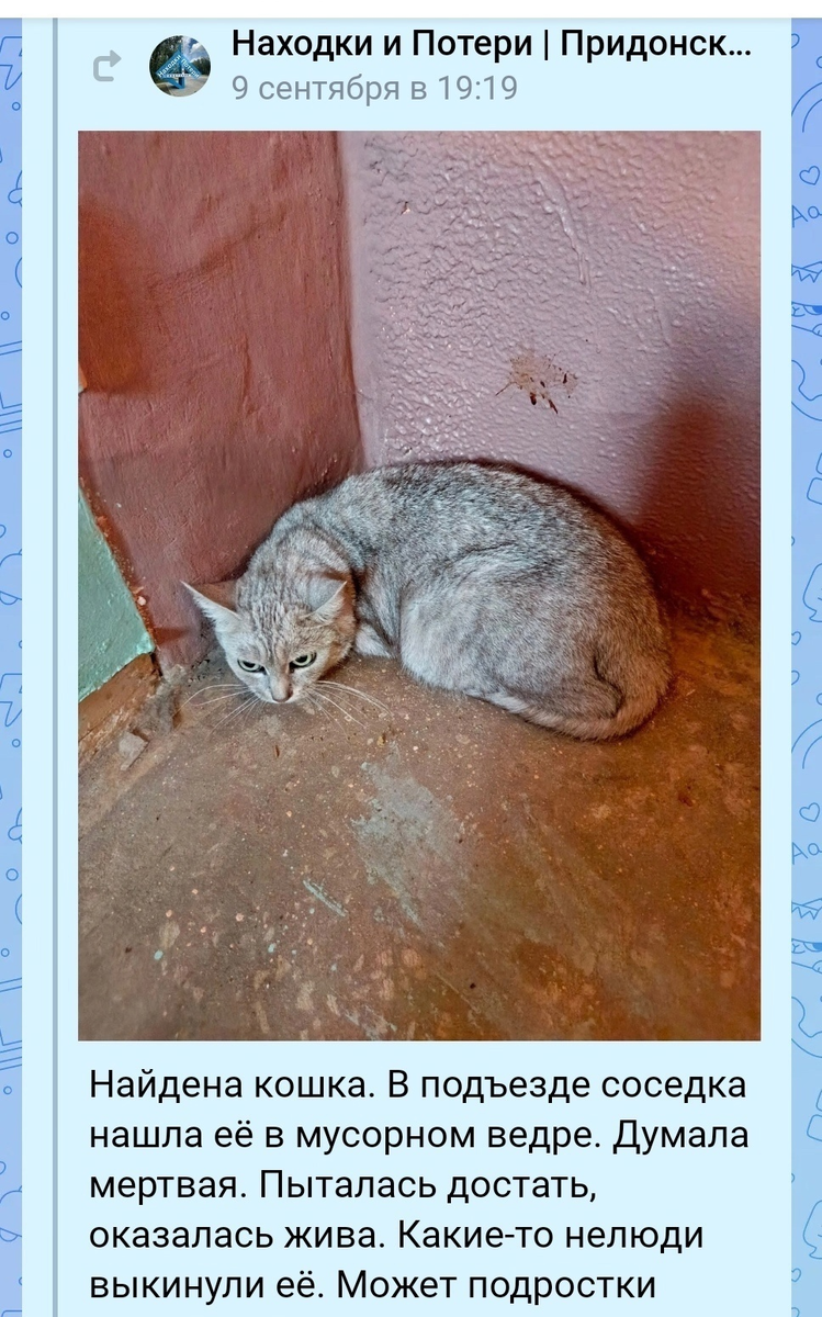 Месяц назад в подъезде многоэтажки нашли белоснежную молодую кошечку. Обессиленная малышка лежала в мусорном ведре. Уборщица решила, что кошка умерла. – Она была в жутком стрессе. Мы долго надеялись, что кошка потерялась, и её ищут, но увы. Никто не переживал за неё. Шло время, кошку поместили в ветклинику, обработали от паразитов, стерилизовали. Назвали Маргоша. Она королева и всё внимание должно доставаться только ей, – рассказала зоозащитница Мила Маякова. Сейчас Маргоша пришла в себя, отъелась, похорошела и готова ехать в новый дом к любящему хозяину. У кошки отличный аппетит, она приучена к лотку. Забрать её можно, позвонив по номеру 8-950-760-2539.