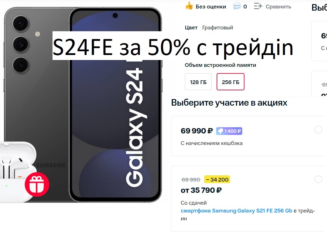 Привет, сегодня для себя обнаружил что МТС да и не только они, все еще предлагают обмен старого смартфона на новый по trade-in, что не может не радовать. Решил привести для вас пример, сколько можно с экономить став старый Samsung s21FE 256gb и получить новенький Samsung s24FE 256Gb. Вы не поверите, но всего за 35790 рублей да еще и наушники с ценой более 7000р в подарок, хотя они пишут что ни стоят 14990р. Чтобы получить скидку заходим на сайт мтс шоп, выбираем нужный самcунг и нажимаем "Со сдачей старого устройства в трейд-ин" Все готово, вы получили больше чем 50% скидку, новый смартфон и наушники в подарок. Подписывайся, не упускай выгоду. Да можете по пробовать промокод MTS5 может получите скидку.