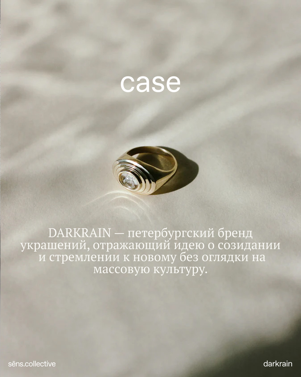 01. о бренде Когда большинство брендов смотрят на тренды и стараются следовать популярным веяниям, DARKRAIN идет против течения. DARKRAIN — петербургский бренд украшений, отражающий идею о созидании, стремлении к новому и поиске оригинальных решений без оглядки на массовую культуру. Перед нами стояла задача отразить эту философию в ребрендинге, передав уникальную эстетику бренда, его аутентичность, внутреннюю смелость и главный посыл: быть вне времени. 02. воплощение Мы разработали бренд-платформу, которая включала в себя 2 ключевые идеи — «непрямая смелость» и «новое в лаконичном». Центральным воплощением этих идей стал созданный логотип, в котором использовался контрастный гротеск и минималистичная антиква. Шрифты, цвета и сдержанная верстка фирменных носителей были выбраны для передачи «холодной интеллектуальности» DARKRAIN. Именно поэтому мы использовали современно-элегантный шрифт Oranienbaum с классическим Roboto Condensed и благородные, но смело играющие друг с другом, цвета. К