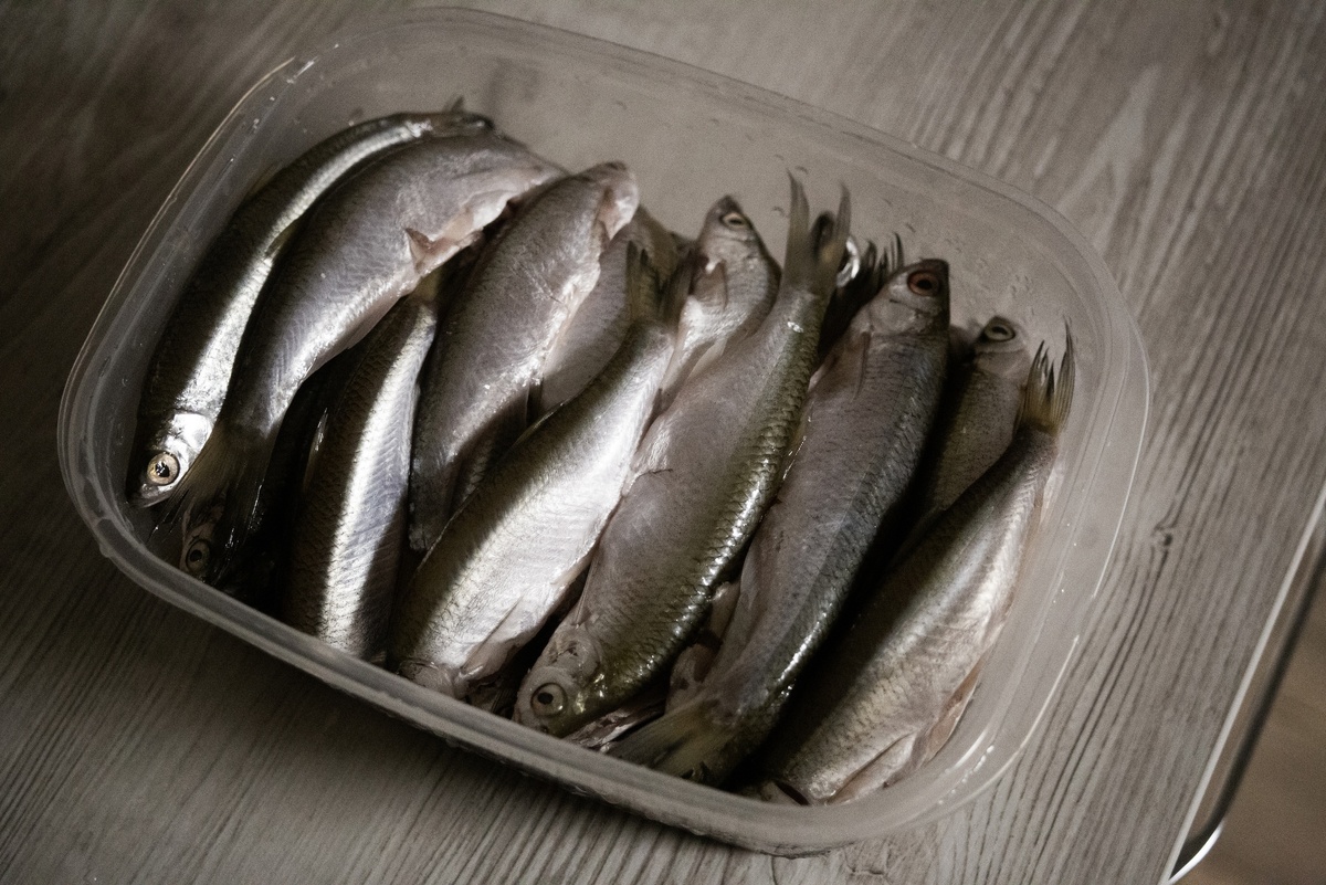 Есть у нас в водоемах такая маленькая рыбка - уклейка. Перемещается обычно большой толпой. Заплывать на глубину опасается, поэтому старается схватить букашку пока та не опустилась. И вот именно этим дико портит жизнь честного рыболова, который вообще-то леща пришел поймать. В один день совсем уж отбою не было, ну я и решил забрать, да приготовить. Поймал штук сто. По меркам уклейки это, кстати, крупный размер. Эта рыба вообще всем своим видом вызывает ассоциации с мойвой или килькой, чем-то таким в общем. Еще шпроты конечно, но технология приготовления шпрот немного напряжная, хоть и доступная мне. Может, как-нибудь в ругой раз сделаю и шпроты. В этот раз захотелось сделать соленую рыбу. Говорят, что можно и не чистить и не потрошить, но я для приличия почистил и удалил всякое, включая жабры. Выдержал несколько дней на большом морозе ибо, во-первых, сразу готовить было лень, а, во-вторых, из соображений обработки от паразитов.