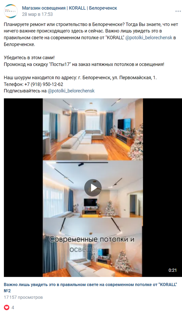 Заказать рекламу 8(989)232-96-93 (WhatsAPP, Telegram) Бюджет: 15 000 р. на 2 соц сети. Цель: повысить узнаваемость и количество реальных покупателей магазина освещения и нятжных потолков "Korall" в Белореченске. Площадки: таргетированная реклама Вконтакте, таргетированная реклама Одноклассники. Срок проведения: 10.03.24-12.04.24. Поскольку заказчик отказался создавать отдельную страницу в одноклассниках, то реклама была от городского сообщества. Вконтакте рекламировали эту группу. Крутили ВК такие креативы, листайте. Тестировали множество вариантов объявлений и аудиторий. Основной бюджет тратили на лучшие связки. Поскольку в одноклассниках сильно сложнее тестировать множество креативов при скромном бюджете, то были выбраны 2 лучших креатива после тестов ВК. Их показатели Заказать рекламу 8(989)232-96-93 (WhatsAPP, Telegram) Полный прайс реклaмного агентства и СМИ "Окей Город" по ссылке https://dzen.ru/a/ZADreHe92QrBG0uc (про таргет в 6).