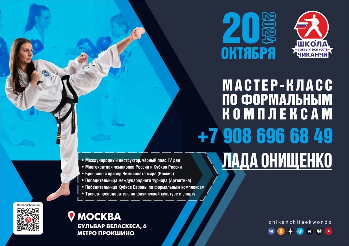 В воскресенье, 20 октября, в московском филиале Школы боевых искусств Анатолия Чиканчи пройдет мастер-класс по формальным комплексам под руководством тренера школы, международного инструктора, обладательницы черного пояса IV дана, многократной чемпионки России, призера чемпионата мира-2004 (Россия), победительницы международного турнира-2020 (Аргентина), победительницы Кубка Европы-2022 (Россия) Лады Онищенко. На тренинг приглашаются все желающие спортсмены от пяти лет и старше, начиная с белого пояса. – Проработаем стойки, темп и жесткость. Расскажу ребятам про систему оценивания формальных комплексов в тхэквондо, – рассказала наставник. Площадкой для проведения мастер-класса станет зал школы «Пионер» на бульваре Веласкеса, д. 6. Записаться можно: 🥋 У своего тренера ☎ По телефону: +7(908)696-68-49 🔗 www.chikanchitaekwondo.tilda.ws/moscow
