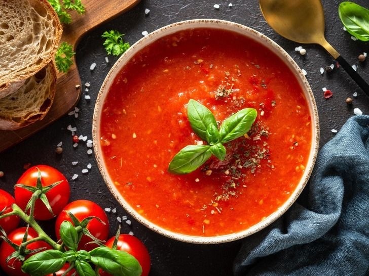 Вот простой рецепт томатного супа: Ингредиенты: - 4 больших помидора - 1 большая луковица - 2 зубчика чеснока - 1 столовая ложка оливкового масла - 1 чайная ложка сахара - Соль и перец по вкусу - Базилик для украшения Рецепт: 1. Очистите помидоры от кожицы. Для этого сделайте крестообразный надрез на каждом помидоре и положите их в миску с кипятком на несколько минут. Затем быстро переложите их в миску с холодной водой. После этого кожицу будет легко снять. 2. Нарежьте очищенные помидоры крупными кусками. 3. Лук и чеснок мелко нарежьте. 4. В большой кастрюле разогрейте оливковое масло на среднем огне. Добавьте лук и обжаривайте до прозрачности, примерно 5 минут. 5. Добавьте чеснок и готовьте еще 1 минуту. 6. Положите нарезанные помидоры в кастрюлю. Добавьте сахар, соль и перец. Доведите до кипения, затем уменьшите огонь и варите около 10-15 минут, пока помидоры не станут мягкими. 7. Перелейте суп в блендер и взбейте до однородной массы. Если у вас нет блендера, используйте погружной