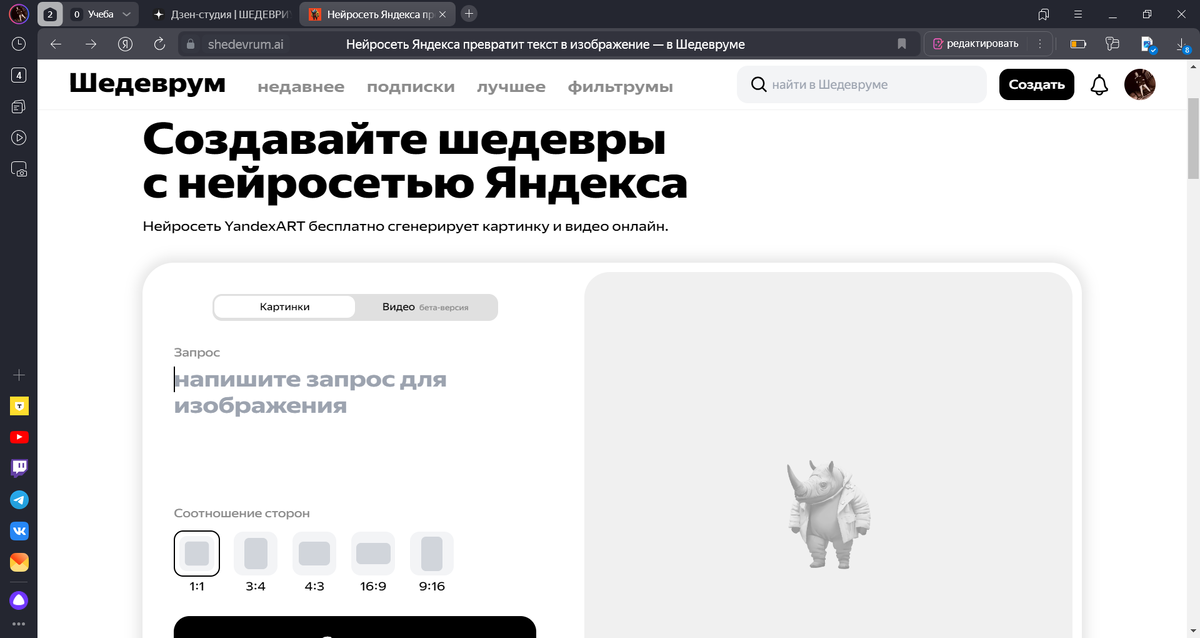 Нейросеть YandexART бесплатно сгенерирует картинку и видео онлайн «Шедеврум» — это приложение для генерации изображений и видео. Оно работает на основе нейросетей YandexART и YandexGPT и способно творить настоящие чудеса. В Шедевруме можно создавать картинки и видео — всего из пары слов. А ещё вы можете загрузить в приложение фотографию, наложить на неё фильтрум и увидеть настоящее волшебство. Просто введите запрос — нейросеть поймёт его и сгенерирует для вас картинку на сайте, а в приложении приложении вы увидите 2 варианта изображения. Вы можете опубликовать изображение в своей ленте, чтобы собирать лайки и комментарии от других пользователей. Все картинки созданные вами можно выложить что и другие пользователи могли их увидеть.Приложение работает на iOS и Android а также на лубом пк через браузер. создано без поддержки Яндекса не является рекламой