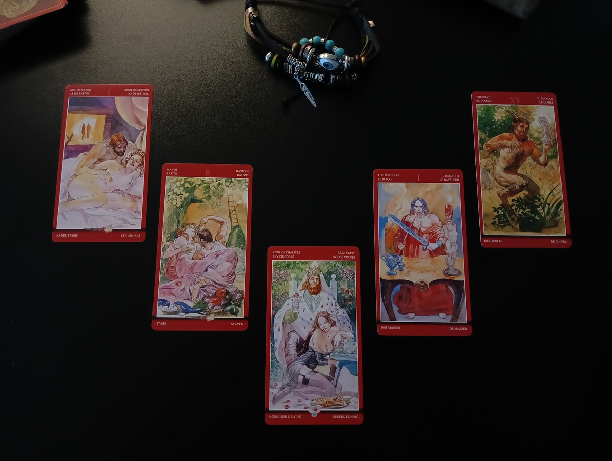 Мои очаровательные подписчицы, подписчики и гости моего канала! Я искренне благодарю вас за просмотры, лайки и комментарии! Благодаря вашей реакции мои статьи и видео находят отклик в сердцах людей! Эта статься попалась Вам на глаза не случайно. Сосредоточьтесь на теме расклада и откройте свой разум для новых инсайтов. Почувствуйте сердцем, откликается ли этот расклад Вашей ситуации. Старайтесь воспринимать эту информацию с юмором. Судьба не часто радует нас, поэтому улыбайтесь чаще (но не слишком 😄 )! Сегодня я хочу поделиться с вами ярким раскладом Таро, который поможет нам раскрыть тайну: «Какой человек предначертан Вам судьбой?» Используя колоду «Магия наслаждений», я выложил на стол пять карт, каждая из которых несёт глубокий смысл и подсказки о том, кто же скоро войдёт в вашу жизнь. Давайте вместе погрузимся в эту загадочную историю. Туз Жезлов открывает наш расклад. Эта карта символизирует вспышку новой энергии, страсти и вдохновения. Судьба готовит вам встречу с человеком, кот