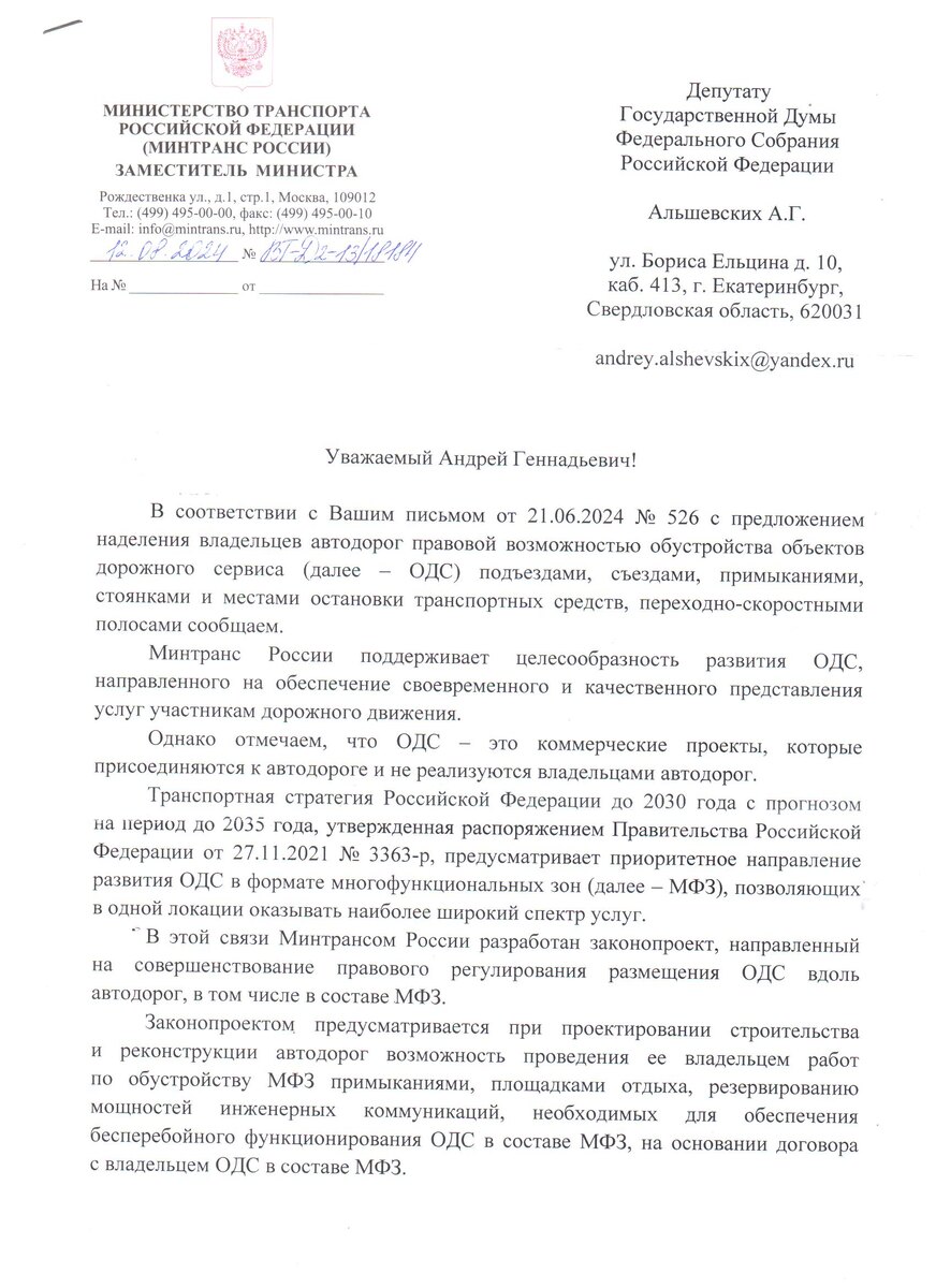 Обсуждал ситуацию с Минтрансом. Высказал мнение, что у владельцев дорог должна быть возможность за свой счет обустраивать доступ к объектам сервиса.