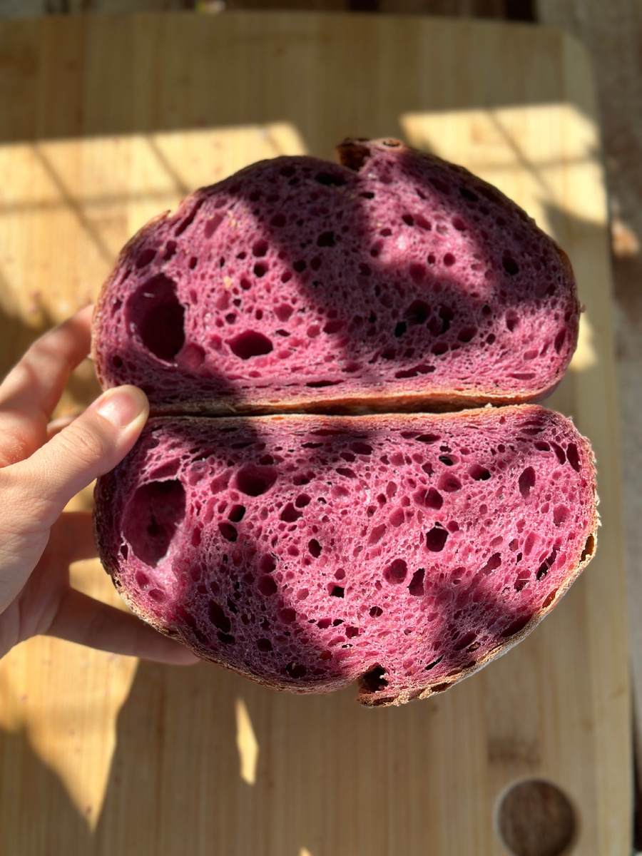 Я нашла решение, которое помогло сделать такой прекрасный розово-фиолетовый хлеб. Вы удивитесь, но это вовсе не пищевые красители из магазина и даже не какие-то сложные ингредиенты. Все гораздо проще и полезнее… Понадобится цветная матча, она обычно сделана из порошка дегидрированных ярких продуктов. Для более фиолетового оттенка подходит матча из фиолетового батата, а для более розового - из питахайи. Никакой химии — а по итогу получаем насыщенные, яркие и стойкие цвета. Этот метод не только безопасен, но и очень прост. Я признаюсь, я не фанат цветного хлеба. Розовый — да, выглядит классно, но вот сине-зеленый… ну, нет, по мне это максимально не аппетитно. 😅 🍞 На свою буханку весом 650 г. я добавила всего 25 г. порошка, и получилось просто вау! Если вы хотите добиться такого же насыщенного оттенка, ориентируйтесь на пропорцию по готовому выходу изделия: примерно 40 г. порошка на 1 кг. готового хлеба . Если хотите более нежный цвет — смело уменьшайте количество вдвое. ⚡️А как пе