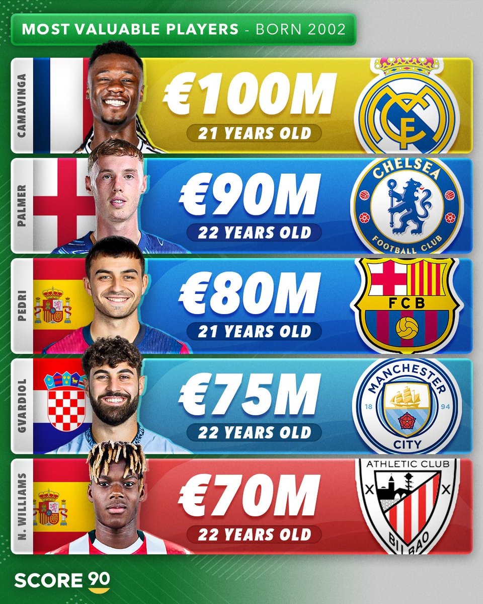 В футболе происходит бесконечная смена поколений – на элитный уровень уже выходят игроки, рожденные в 21 веке. Портал Score 90 собрал списки из пяти самых дорогих футболистов по каждому году рождения с 2002-го по 2007-й. Ребята, которым в этом году исполняется 22, уже стали звездами в своих клубах – вы наверняка знаете всех. Джуд Беллингем родился в 2003-м, но уже стоит 180 млн евро – третий в списке всех футболистов (после Эрлинга Холанда и Винисиуса). 2004-й. Гави не играл почти год, но его талант настолько большой, что травма крестов почти не отобразилась на ценнике. Самые дорогие игроки 2005 года рождения играют в «Манчестер Юнайтед». Лени Йоро пока на травме, а Кобби Майну сверкает в основе еще с прошлого сезона. Эндрик, рожденный в 2006-м, уже наделал шума и перешел в «Реал». Уоррен Заир-Эмери стоит те же 60 млн евро, но на европейском уровне показал больше. Пока нет предпосылок, что рейтинг самых дорогих игроков 2007 г.р. когда-то изменится – настолько хорош Ламин Ямаль.