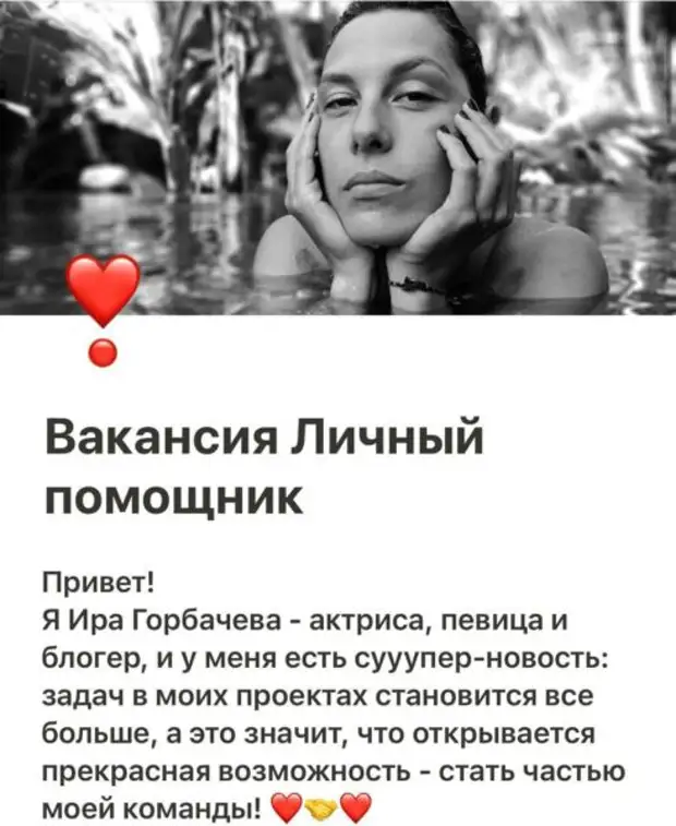 Актриса Ирина Горбачёва разместила объявление о поиске сотрудника, но её требования вызвали насмешки в интернете.