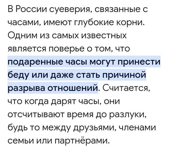 Сижу пью чай,никого не трогаю, листаю соц.сети и тут бац... Вижу комментарий: -"А Вы вообще в курсе, что любимому человеку нельзя дарить часы"? с возмущением пишет молодая особо девушке, которая выставила свой подарок от мужа на всеобщее обозрение. Ну... Думаю... -" Здрасте... Приехали... Опять в каменный век попали"... -"А что часы сделают плохого"? опередил мои мысли какой-то подписчик. Девушка присылает скриншот с какого-то важного ( по её мнению) сайта и как аргумент, мы все дружно начинаем читать: подаренные часы могут принести беду или даже стать причиной разрыва отношений! Считается, что когда дарят часы, они отсчитывают время до разлуки, будь то между друзьями, членами семьи или партнерами... Серьезно!? А я думала, что в расставании всегда виноваты люди, чаще всего оба. И мужчина и женщина. Один другого перестал понимать, слышать, любить, ценить, уважать. У кого-то в ход пошли измены... Второму надоело все это терпеть и пара рассталась... Часы??? До сих пор думаю, при чем