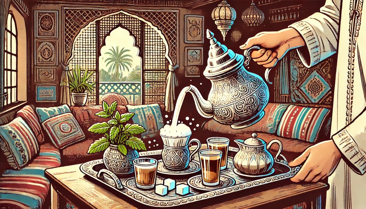 Марокканский чай готовят из зелёного чая, свежей мяты и большого количества сахара. Процесс приготовления — это настоящее искусство, и оно включает несколько шагов: