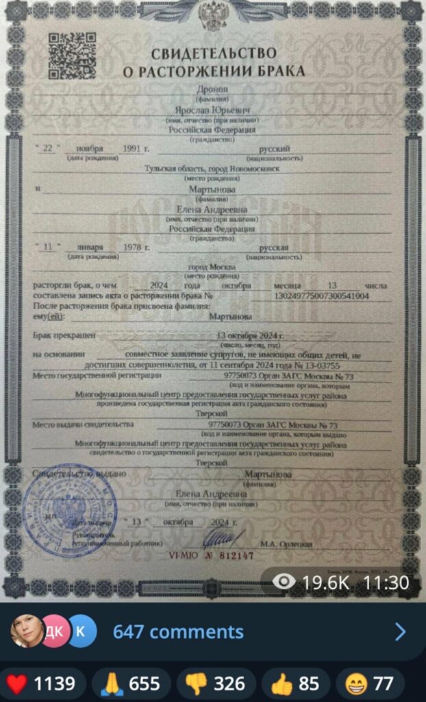 Ярослав Дронов сообщил об официальном расторжении брака со своей второй женой. О грядущем разводе певун объявил в конце сентября, и поклонники втайне мечтали о том, что, «ну, может быть, они все-таки помииииирятся». «Родные, мы с Еленой – очень занятые люди. К сожалению, такой график работы и уровень занятости не оставил нам времени на нормальную личную жизнь. Развод – наше совместное решение. Мы остаемся в хороших отношениях, без каких-либо конфликтов и обид», – прокомментировал тогда заслуженный певун России. Нет, не помирятся. Вчера в этом деле была поставлена окончательная жирная точка. Юридическая. О чем информирует портал Super. Теперь Дронов (в сети его, к слову, не так давно прозвали Беспилотниковым – эдакая аллегория) – полностью свободный мужчинка. Сегодня он выложил в сеть скриншот свидетельства о расторжении брака с Еленой Мартыновой. Если верить документу, пара вновь сходила в ЗАГС в воскресенье, 13 октября. ЗАГСы работают по воскресеньям? Фото: телеграм-канал Дронова