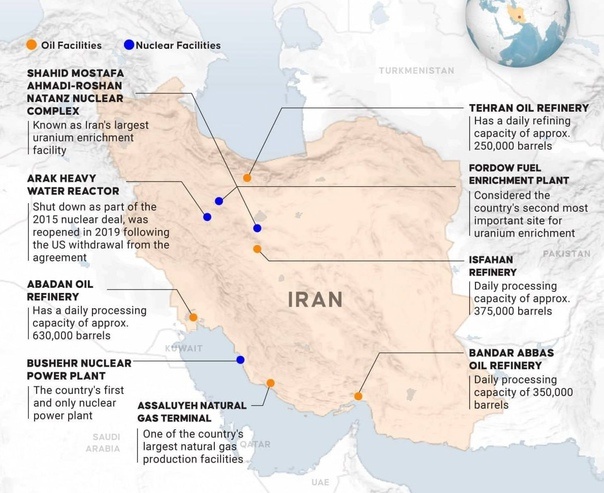 Ближний Восток продолжает пылать. Кому-то мало того ужаса, который там происходит, той крови, которая там льется неисчислимыми потоками. СМИ продолжают набрасывать. Израильское ТВ сообщило, что Иран не будет отвечать на удар Израиля, если удар будет не сильный, как говорится, в пол шишечки. А вот то, что может послужить целями. Иранские нефтяные и ядерные объекты. Ядерные объекты: 1) Ядерный комплекс имени Шахида Мостафы Ахмади Рошана в Нетензе; 2) Реактор на тяжелой воде в Эраке (он же Солтанабад); 3) АЭС в Бушере; 4) Завод по обогащению ядерного топлива Фордоу недалеко от города Кум. Объекты нефтяной и газовой промышленности; 1) Нефтеперерабатывающий завод в Абадане (город-порт на юго-западе Ирана) с ежедневной мощностью до 630 тыс. баррелей; 2) Газовый терминал в Эселуйе; 3) Нефтеперерабатывающий завод в Тегеране (ежедневная мощность — ок. 250 тыс. баррелей); 4) Нефтеперерабатывающий завод в Исфахане (ежедневная мощность — порядка 375 тыс. баррелей); 5) Нефтеперерабатывающий завод в