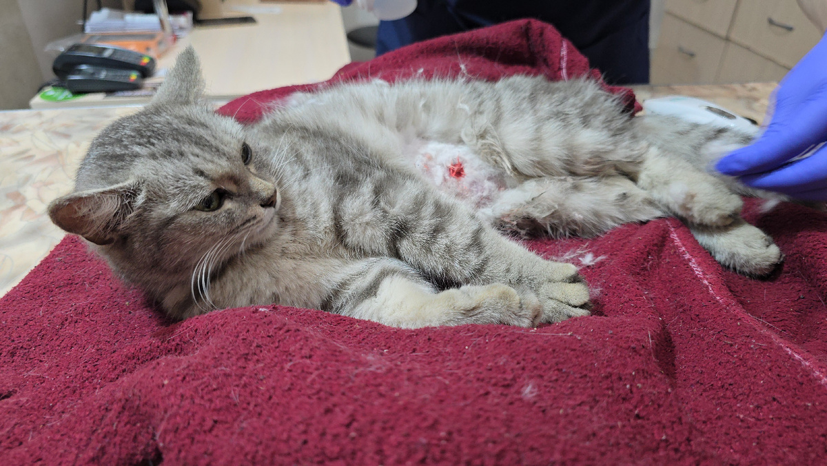 Сильно пострадала от собак на самовыгуле, потеряла детей, которые вот-вот должны были родиться, перенесла операцию по удалению прокушенной матки, заштопали в нескольких местах прокусы на теле, потом гнойные абсцессы, чистка, боль, потом выясняется, что позвонок раздроблен, операция на позвоночник, лапки задние отрафировались, операция по удалению контрактуры на одной лапке, фиксаторы делают больно при каждом движении, за тем удаление контрактуры на второй лапке, тоже фиксатор.