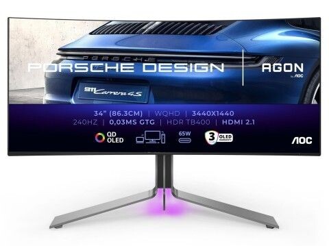 Специалисты компаний AOC и Porsche Design совместно разработали новый монитор AGON Pro PD34. Он оснащён одним из лучших экранов, доступных на рынке, а также встроенной аудиосистемой. Монитор имеет изогнутый 34-дюймовый экран QD-OLED с разрешением 3440 x 1440 пикселей и соотношением сторон 21:9. Благодаря времени отклика 0,03 миллисекунды (GtG) и частоте обновления 240 Гц, изображение отображается без задержек и с плавной анимацией. Пиковая яркость дисплея составляет 1000 нит, а сертификация VESA DisplayHDR True Black 400 подтверждает широкий динамический диапазон экрана. Он способен отображать 1,07 миллиарда оттенков, покрывая 100% цветового пространства sRGB, 99% AdobeRGB и 99% DCI-P3. Благодаря низкой задержке ввода и технологии Adaptive-Sync, монитор устраняет разрывы изображения во время отображения динамичных сцен. Монитор сертифицирован по AMD FreeSync Premium Pro и поддерживает NVIDIA G-Sync. Дизайн подставки монитора похож на рулевое колесо и спицы колёс 911, а задняя часть нап