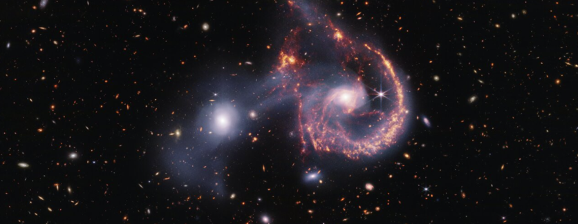 Орбитальный телескоп «Джеймс Уэбб» сделал потрясающий снимок, на котором видно, как взаимодействуют две галактики: эллиптическая и спиральная. Эти космические объекты получили название Arp 107. Для съёмки использовались две камеры. Исследование галактик с помощью инфракрасных камер Для получения изображений использовались две инфракрасные камеры: ближнего инфракрасного (NIRCam) и среднего инфракрасного (MIRI) диапазонов. На снимке можно разглядеть тонкий звёздный мост, который образовался в результате гравитационного взаимодействия. Благодаря камере MIRI, телескоп смог зафиксировать области активного звездообразования и органические молекулы, похожие на сажу. Особое внимание исследователей привлекла сейфертовская галактика. Учёные выяснили, что столкновения галактик могут приводить к сжатию газа и созданию более благоприятных условий для формирования новых звёзд. Полученные фотографии помогут астрономам лучше понять процессы, происходящие при слиянии галактик.