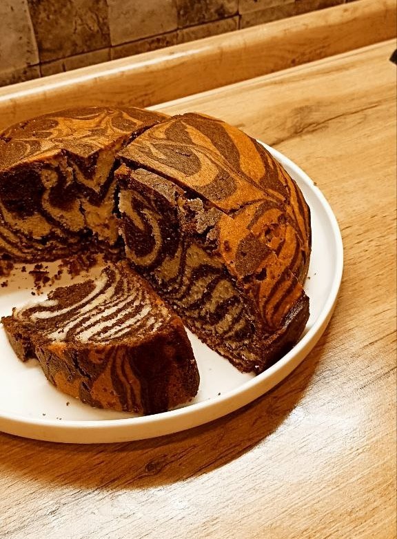 Пирог детства , много вариантов этого пирога, я поделюсь рецептом самым удачным, кто любит ванильный и шоколадный бисквит Рецепт: яйца 4 шт 350 г муки 250 г сахара 100 мл молока 180 мл растительного масла 10 г разрыхлителя 10 г ванильного сахара 30 г муки в одну половину теста 20г какао в другую половину теста Яйца взбиваю венчиком с сахаром и ванилином, добавляю теплое молоко, растительное масло и все хорошо перемешиваю. Добавляю муку с разрыхлителем и тщательно все перемешиваю. Тесто делю на две равные половины. В одну добавляю муку, в другую какао. Форму (23 см.) дно и бортики застилаю пергаментной бумагой.Вливаю поочередно в центр по одной столовой ложке разного теста. Выпекать пирог 40 мин в разогретой духовке при 180 гр. Вкусная выпечка готова !